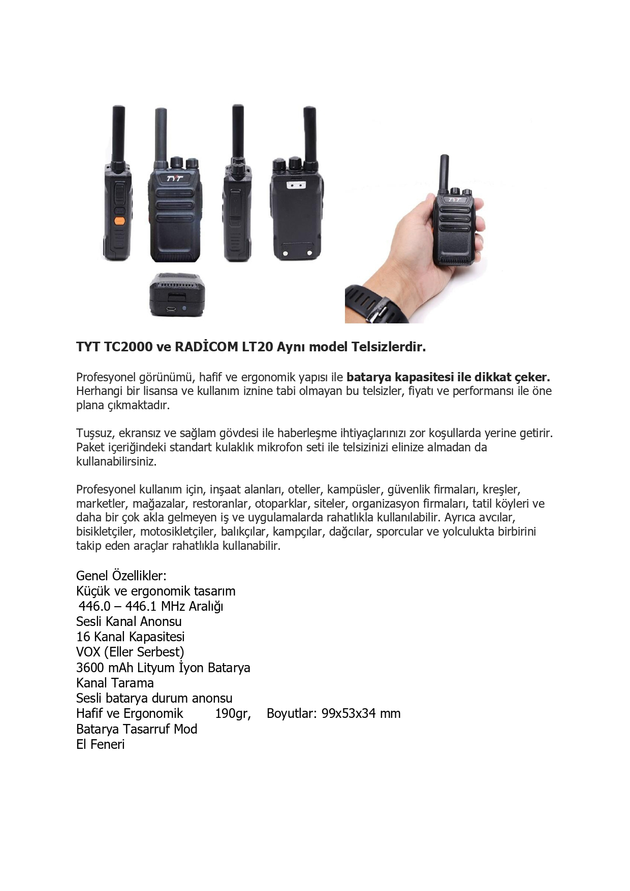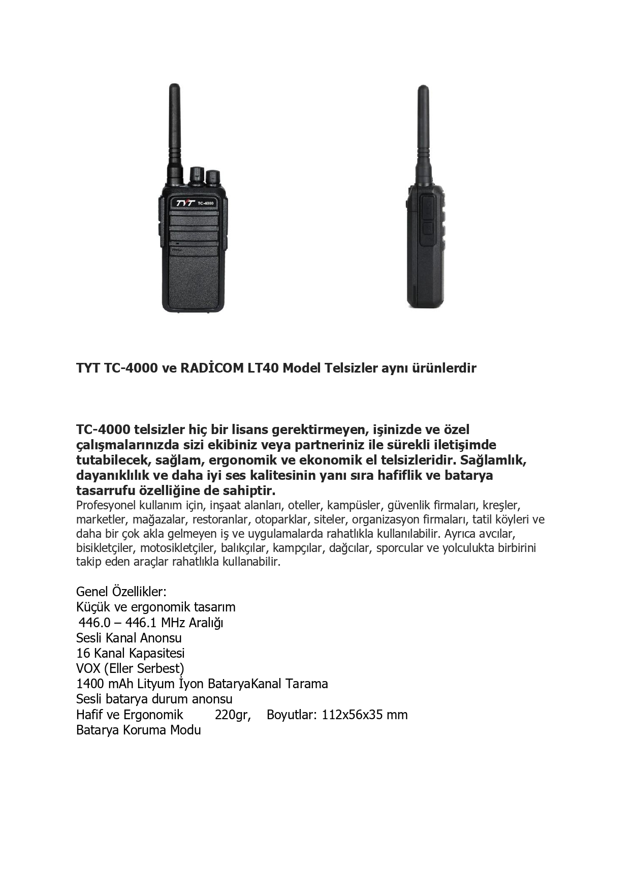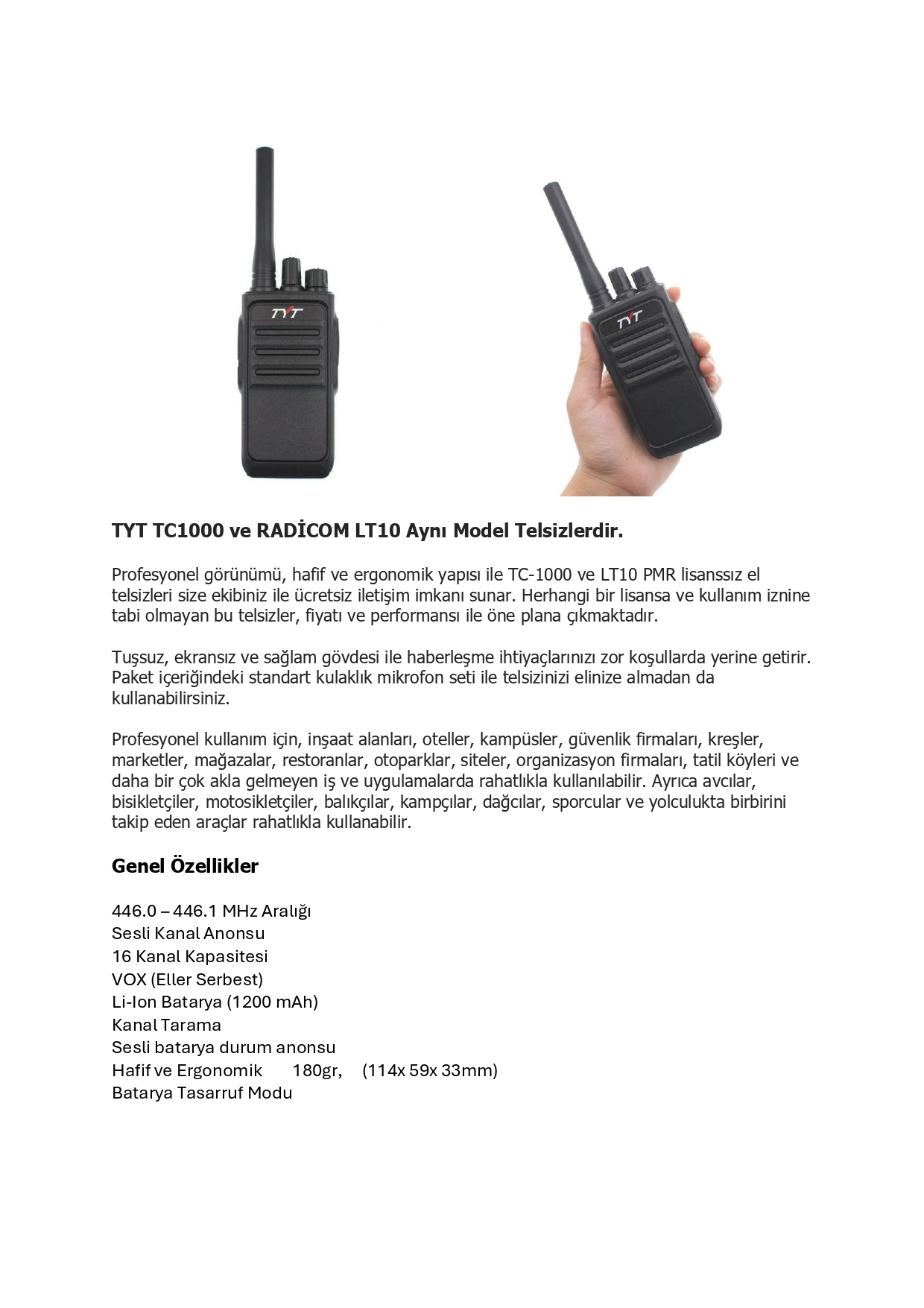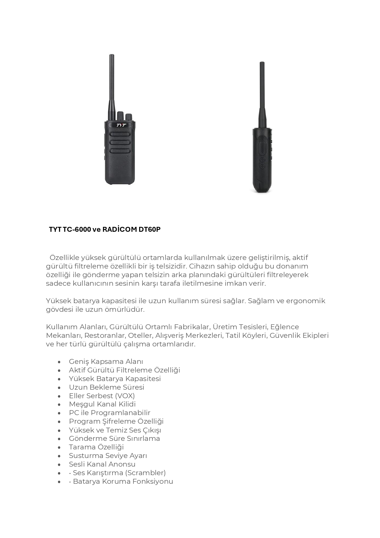 Türkiye genelinde, 30 yıldır tüm meslek ve iş güvenliği alanlarında kullanılan telsiz sistemlerinin satışını, teknik bakım - onarım ve servis hizmetlerini, anten, kulaklık ve batarya tedarikini sağlamaktadır.
